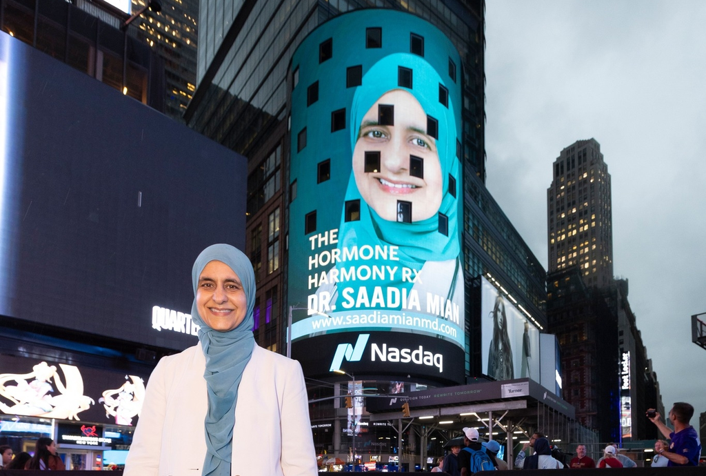 Dr. Saadia Mian on the NASDAQ Jumbotron in New York Times Squares. Stay tuned for her book, 'The Hormone Harmony Rx' to be released in 2026.