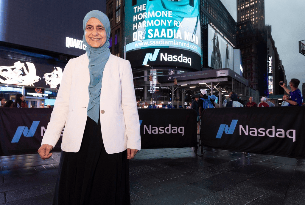 Dr. Saadia Mian on the NASDAQ Jumbotron in New York Times Squares. Stay tuned for her book, 'The Hormone Harmony Rx' to be released in 2026.